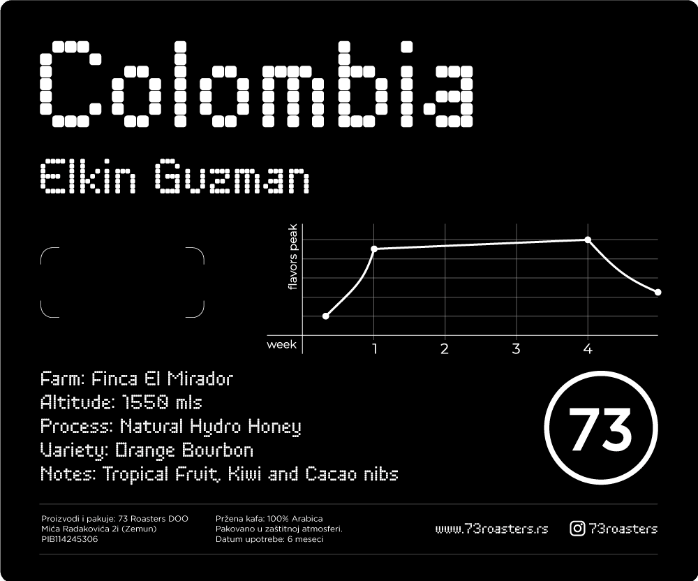 Elkin Guzman uzgaja kafu na 31 hektaru u okviru farme Finca El Mirador u Palestini, regija Huila. Velike nadmorske visine i plodna zemljišta u Huili pružaju odlične uslove za gajenje specijalnih kafa. Da bi dodatno razlikovao svoje kafe, Elkin eksperimentiše sa inovativnim metodama obrade, kao što je Hydro Honey proces koji je korišćen kod ove partije. Eksperimentalni procesi sve više dobijaju na značaju na tržištu i nude veliki potencijal. Oni ne samo da smanjuju potrošnju vode, pružajući održivu alternativu za proizvođače kafe, već omogućavaju i razvoj jedinstvenih senzornih profila.